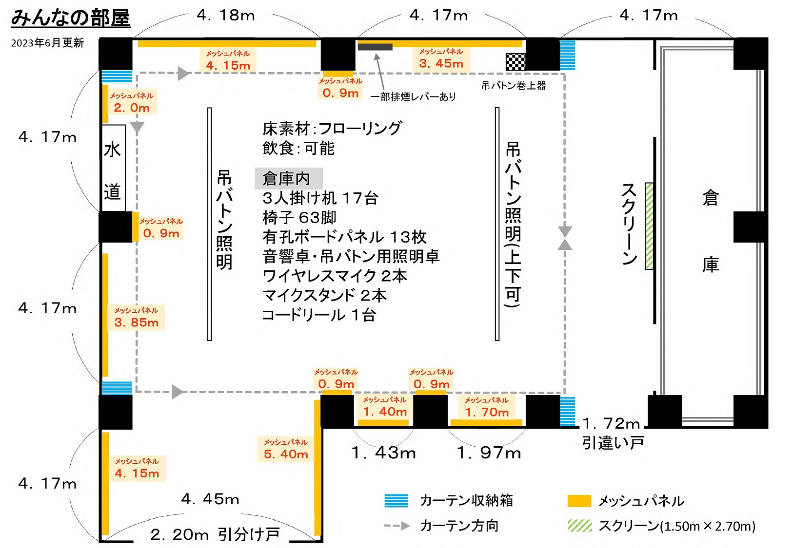 | 備品 | 移動式音響卓・吊バトン用照明卓・マイク2本・マイクスタンド2本・コードリール・スクリーン・組み立て式有孔ボード13枚・常設メッシュパネル・ボード用フック・水道(飲料可) |