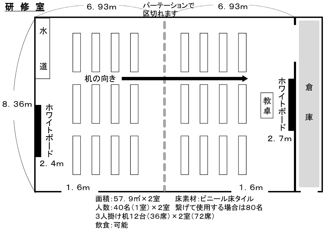- 上の写真は仕切りを外し、研修室1・2を同時に使用した場合です。