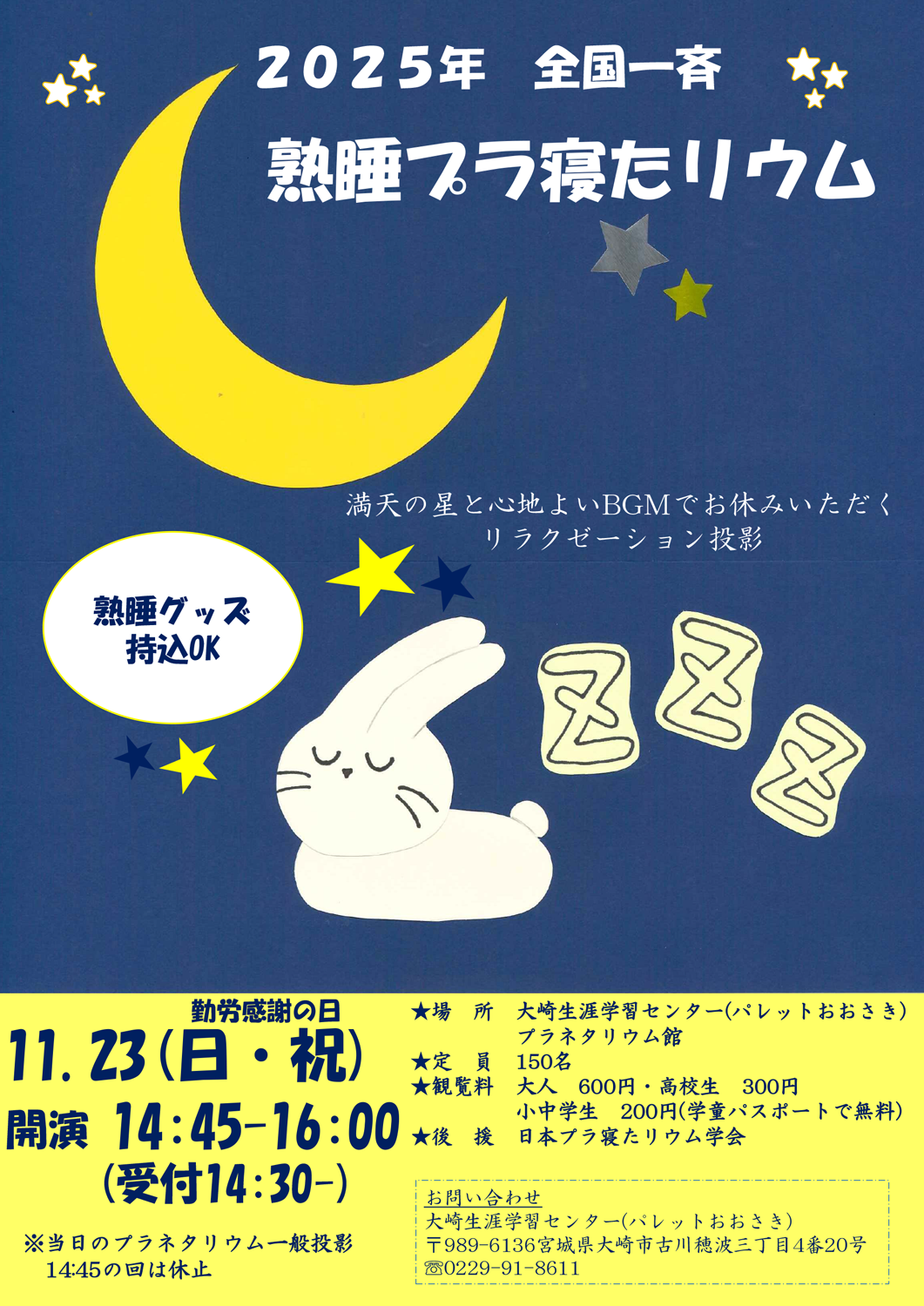 2011年11月に兵庫県明石市天文科学館でスタートした熟睡プラ寝たリウム。翌年2012年11月からパレットおおさきも開始し、毎年全国一斉イベントに参加しています。
