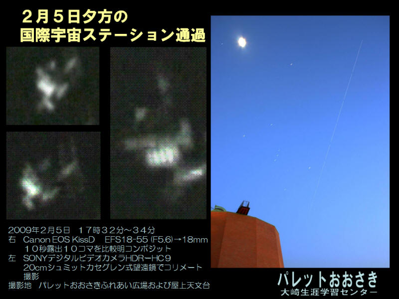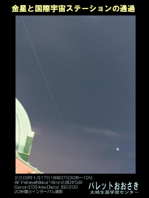 宇宙飛行士・若田光一さんが長期滞在する予定の国際宇宙ステーションが、2月3日大崎の宵の空を横切った時の写真です。一番明るいのは月で、左下にオリオン座がみえます。18時10分すぎ、カシオぺヤ座の近くに見え始め、空の真上あたりを通過、月をかすめオリオン座を突き刺し、15分ごろおおいぬ座の一等星シリウスの手前で地球の影に入り、消えていきました。