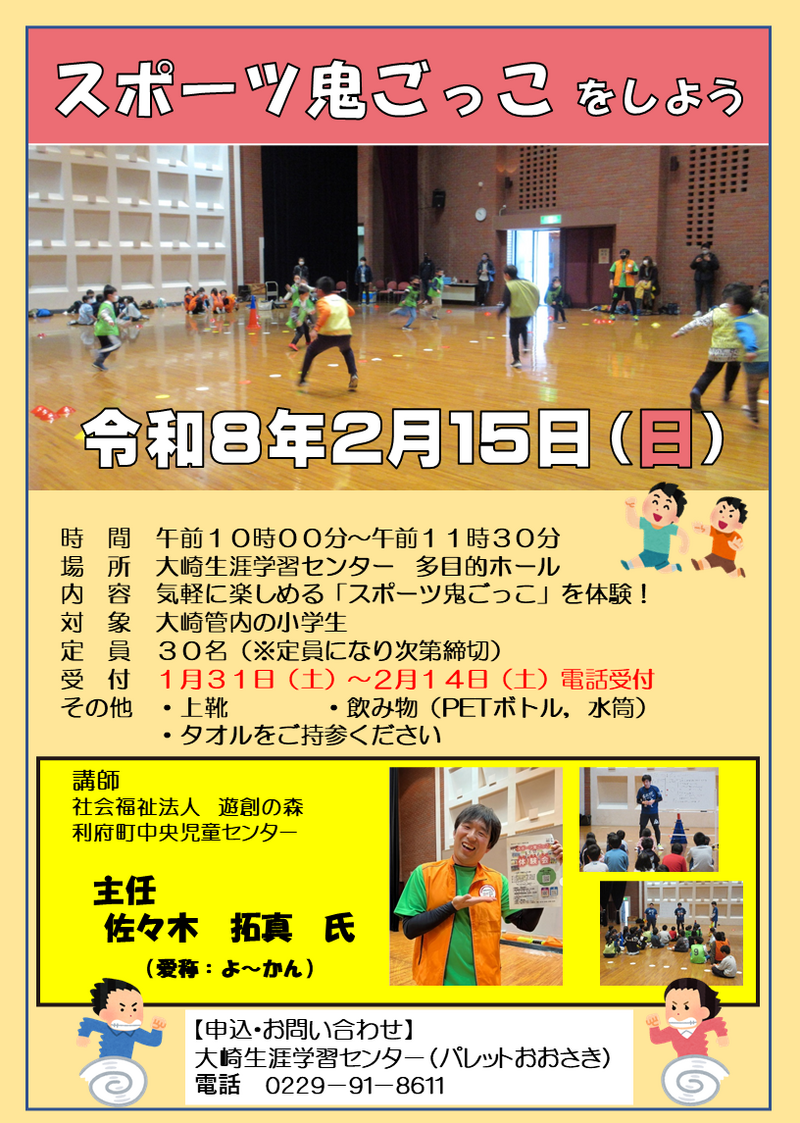 | 定員 | 大崎圏域内の小学生 30名 2月1日(日)定員に達しましたので受付終了しました。 |